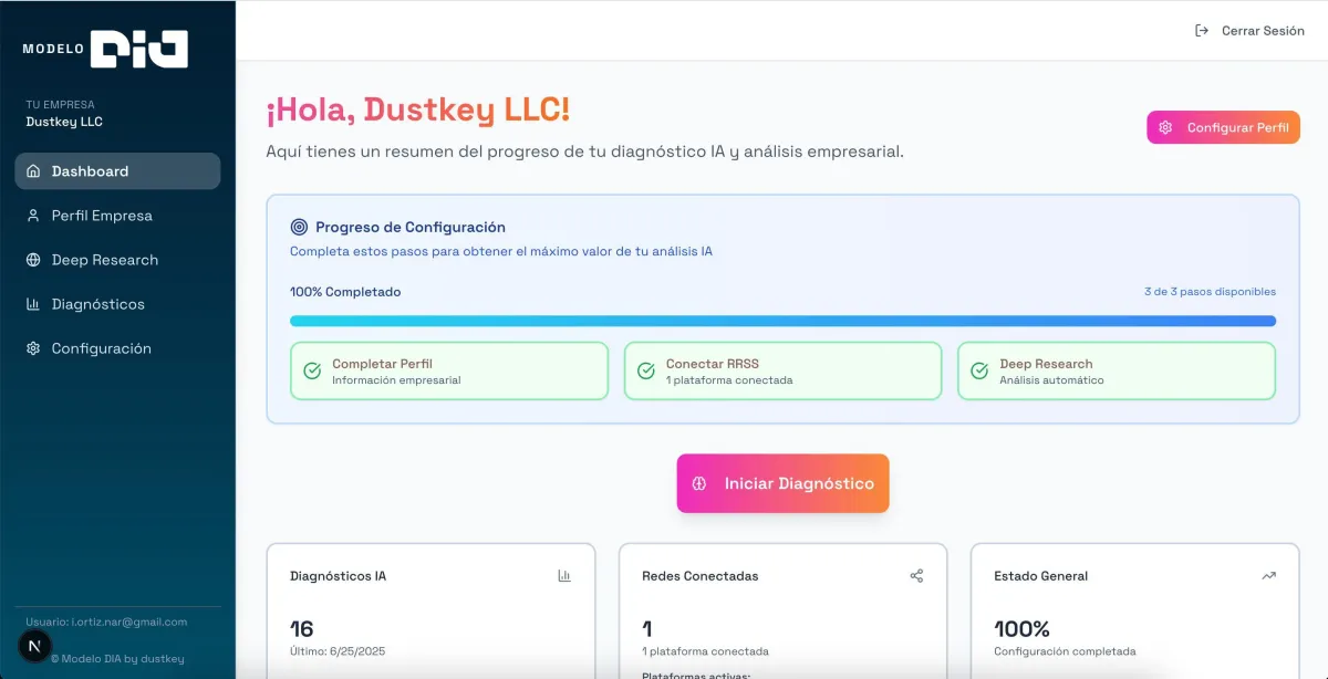 Más allá del informe detallado, la plataforma del Modelo DIA te ofrece soporte continuo a través de tu Plataforma Personal de Por Vida. En tu Dashboard Personal, podrás visualizar tus soluciones y acceder a toda tu información clave de forma clara y personalizada, cuando quieras y desde cualquier dispositivo. Si tu negocio evoluciona, añadiendo la nueva información puedes volver a correr un diagnóstico para obtener nuevas recomendaciones.